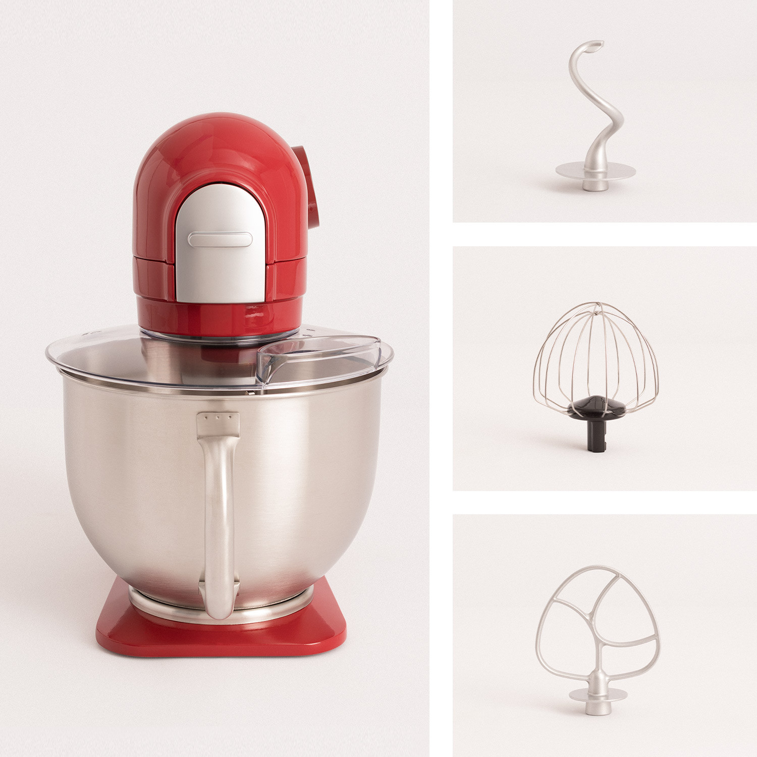Tiene 3 tipos de accesorios: Un gancho amasador, una varilla para emulsionar y montar, y la pala amasadora. Todos son fácilmente intercambiables según tus necesidades.