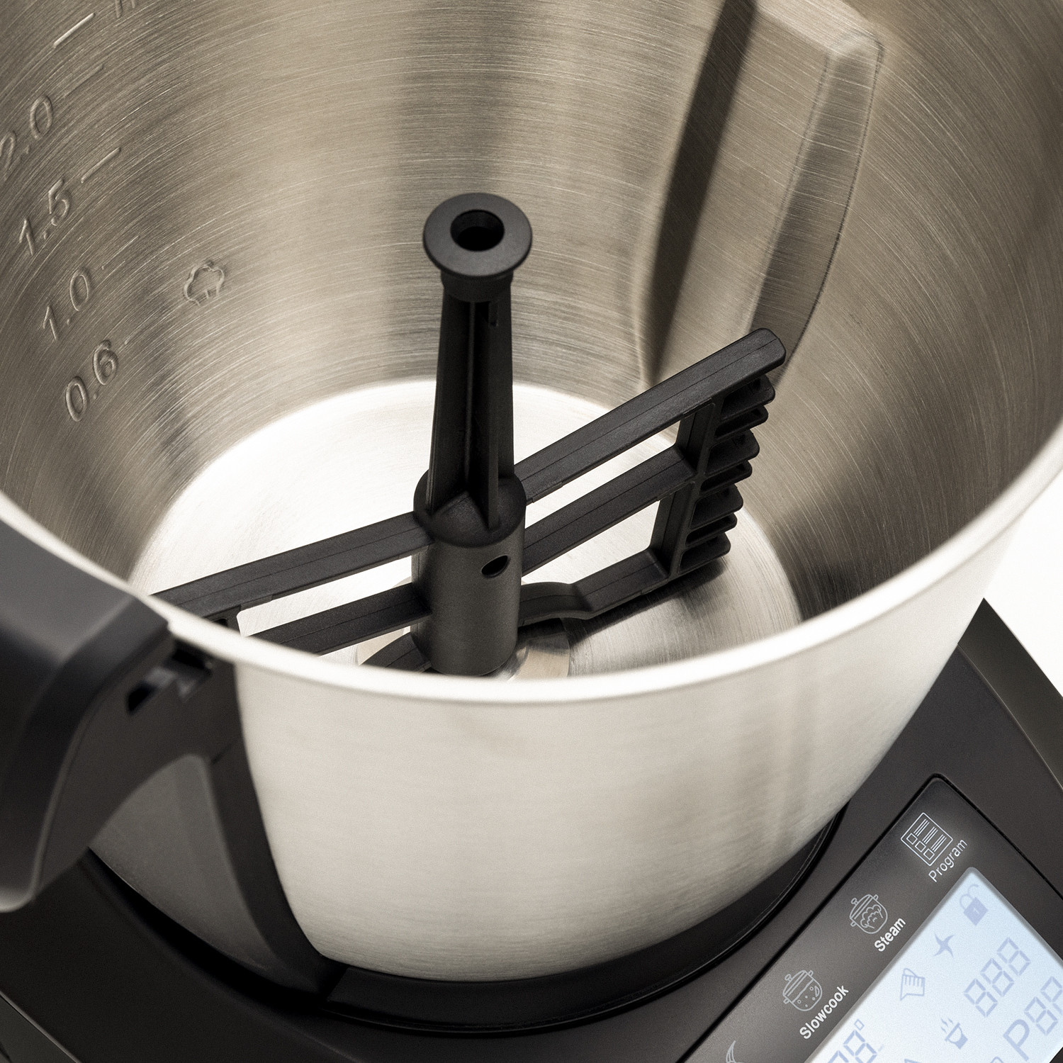 Con termostato de seguridad: En caso de sobrecalentamiento, el chefbot se detendrá para evitar averías. Con tan solo presionar el botón de reinicio bajo el bol, una vez que haya enfriado, volverá a funcionar con normalidad. Más información en el manual