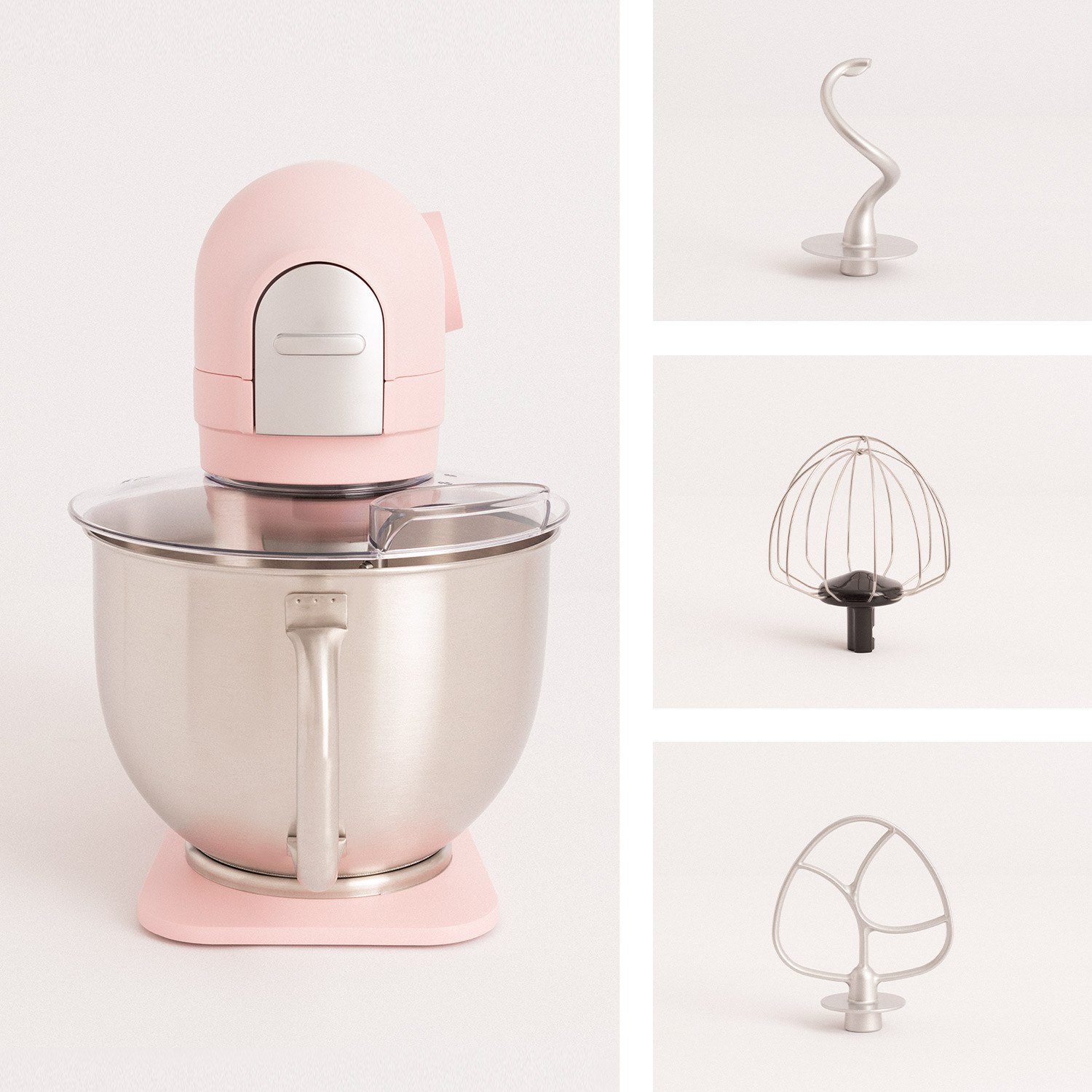 Il a 3 types d'accessoires : un crochet de pétrissage, un fouet pour émulsionner et monter, et la lame de pétrissage. Ils sont facilement interchangeables selon vos besoins.