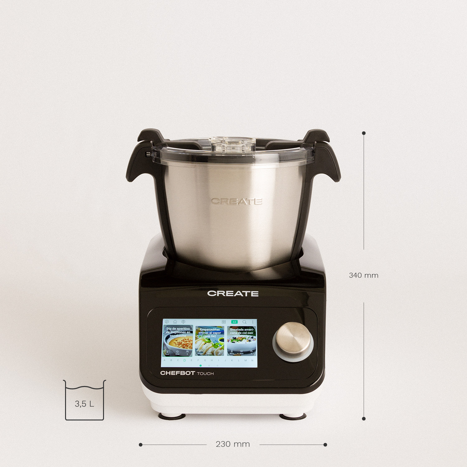 Keukenrobot met touchscreen, wifi-verbinding en weegschaalfunctie. 28 automatische programma's met eenvoudige en intuïtieve bediening, van eenvoudige taken tot het voltooien van het recept. Verbind uw Chefbot Touch met het Wi-Fi-netwerk en u kunt periodiek de meer dan 100 vooraf geïnstalleerde recepten bijwerken. Compact en zeer licht, met meerdere keukenfuncties en accessoires.