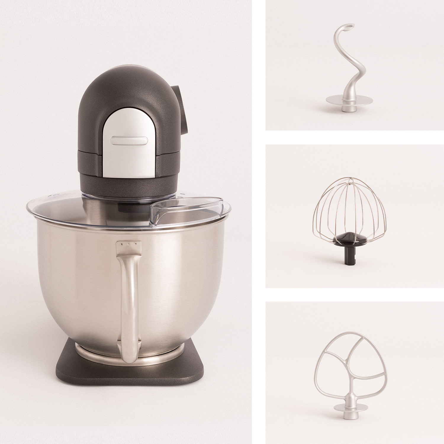 Possui 3 tipos de acessórios : um gancho de amassar, uma haste para emulsificar e montar e a lâmina de amassar. Todos eles são facilmente intercambiáveis de acordo com suas necessidades.
